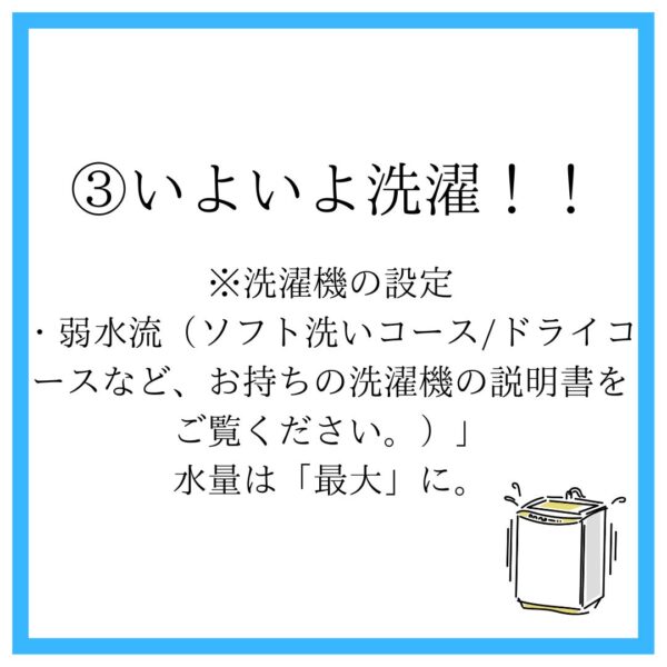 ご自宅の洗濯機の仕様に合わせて、優しく洗えるコースでの洗濯をオススメします。